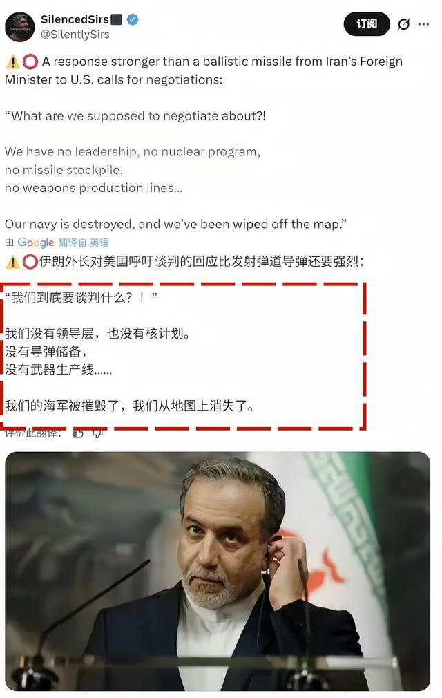 伊朗外长阿拉格齐回怼:“我们没有领导层,也没有核计划,没有导弹储备,没有武器生产线...我们的海军被摧毁了,我们从地球上消失了。我们还要谈什么?”