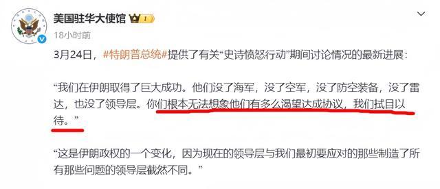 美国驻华大使馆微博发布了“史诗愤怒行动”的最近进展:“我们在伊朗取得了巨大成功。他们没了海军,没了空军,没了防空装备,没了雷达,也没了领导层。你们根本无法想象他们有多么渴望达成协议,我们拭目以待。”